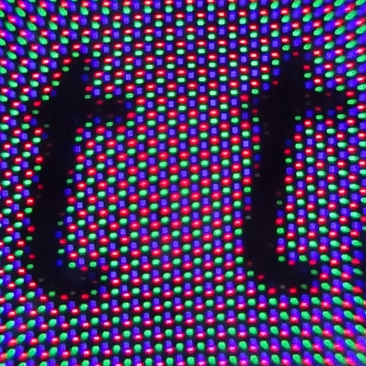 That looks like a clean match to me. We're looking at the screen lighting up every second RGB triplet, both horizontally and vertically. If in any doubt, we could try to take exactly the same image with an off-black background, to see the in-between triplets. As that's beyond what I can reproduce, here I have digitally superimposed an approximation of how it would look like.