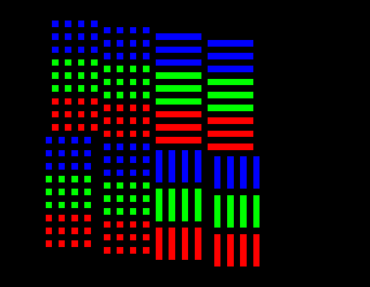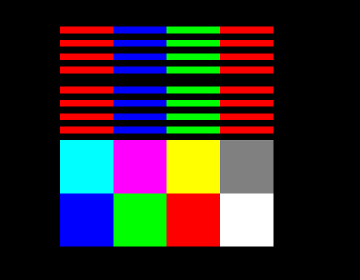 That would suggest that this screen, rather than having a true resolution of 1080x2340 square pixles, has a resolution of 720x2340 rectangular pixels, onto which a 1080 by 2340 pixel image gets mapped. Since the sample area I can capture like this is so small, there is room for error in my method, but let's look at some more tests. In the following, all pictures are taken with the Astro screen in its normal landscape mode. Here are some striped patterns of single pixel wide lines and some 8x8 pixel single colour blocks.