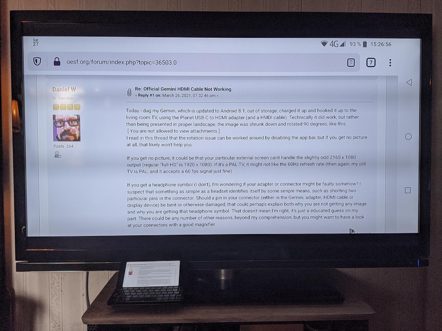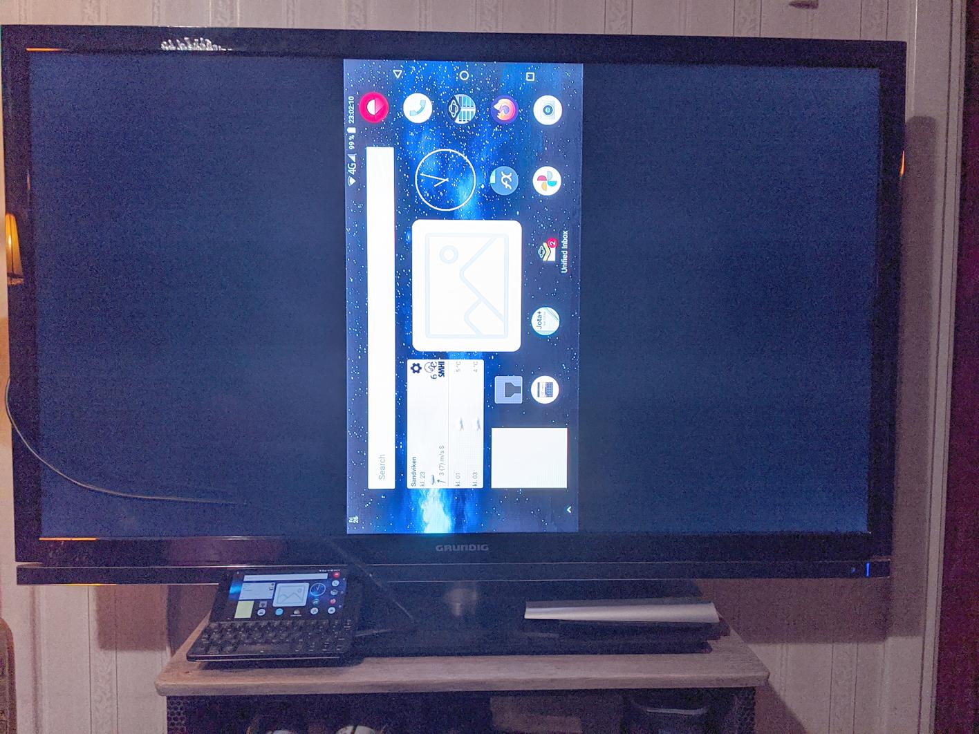 Today I dug my Gemini, which is updated to Android 8.1, out of storage, charged it up and hooked it up to the living room TV, using the Planet USB-C to HDMI adapter (and a HMDI cable). Technically it did work, but rather than being presented in proper landscape, the image was shrunk down and rotated 90 degrees, like this: