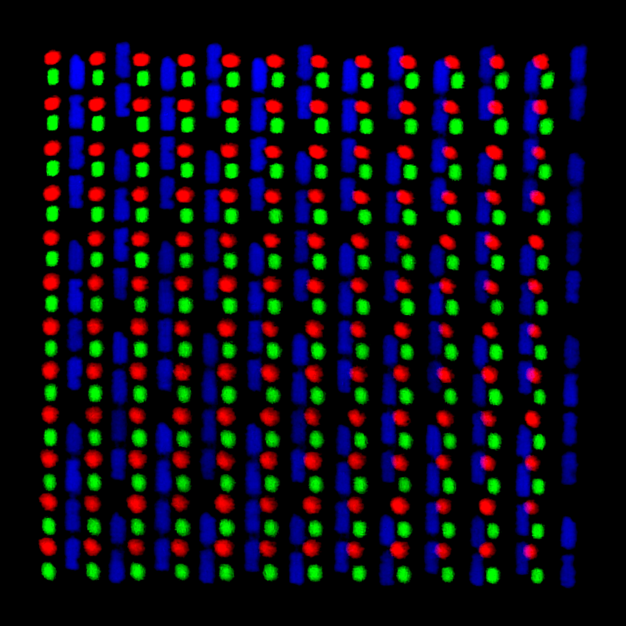 I may have to draw some test images and (try to) take close-ups of, to verify that a full triplet per pixel is actually used.