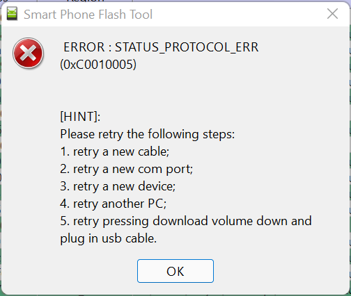 As @Shiunbird1 tried reformatting the flash I tried this myself. Again, only with an error message. This time nothing is printed in the status area - not even a timer. Shortly after I start this action I can hear the USB connection sound on my PC and a message is shown, that the last connected USB device could not be identified. After the period of time set in options for 'timeout' the timeout occurs