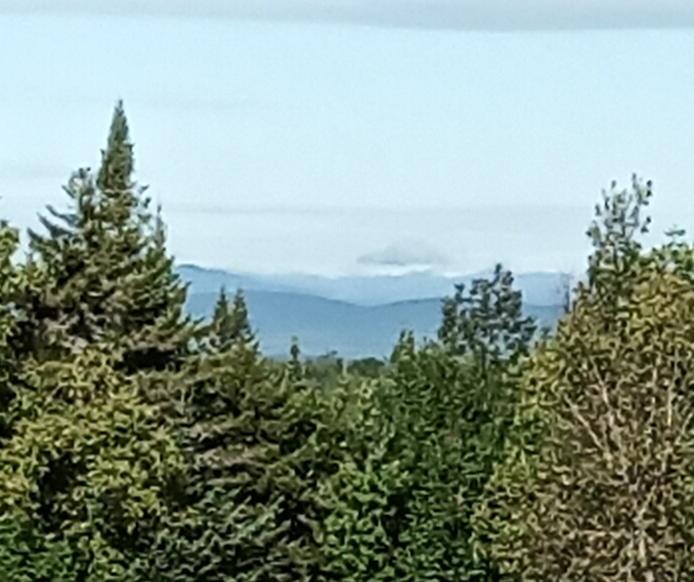 Stock JPEG, 100% crop, with blotchy trees and grayish mountains and sky:
