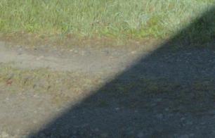 Stock JPEG, 100% crop, blotchy grass and gravel road, no shadow detail: