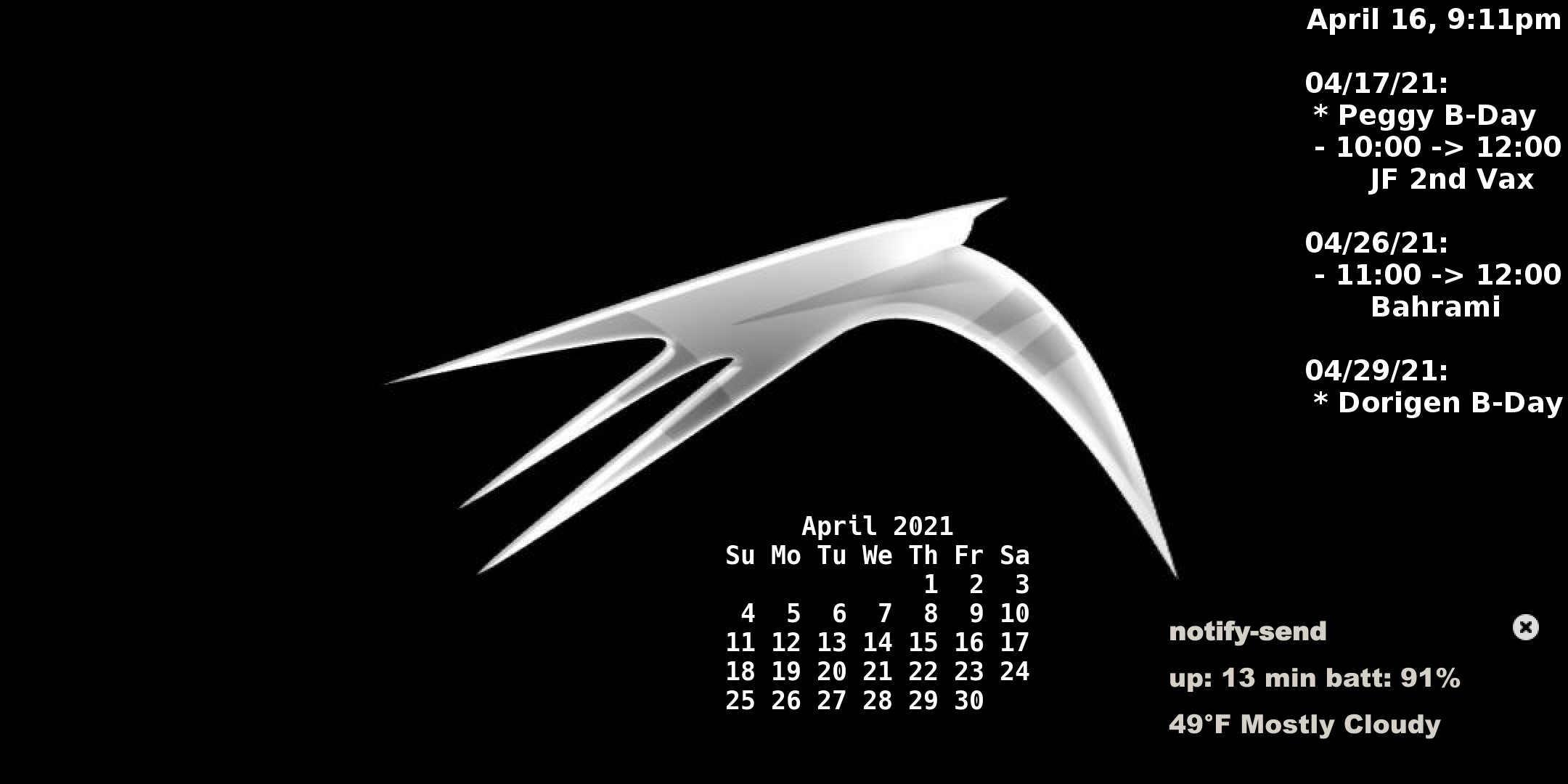 CALENDAR EDIT #1: installing gcal and using gcal in place of cal (eg: $alignc${font Hack:style=Bold:size=13}${exec gcal} appears to alleviate formatting issues and exact positioning of the calendar on the desktop no longer seems necessary]