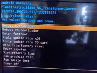 Right now, even if I do a shut down, during which I unplug everything, the Astro, weirdly enough, spontaneously boots again, but if I do a shut down and holds volume up until it boots again, I get the "No command" on the external screen. From there I can hold the power button and and tap volume up to get to the recovery menu. I haven't yet ventured further.