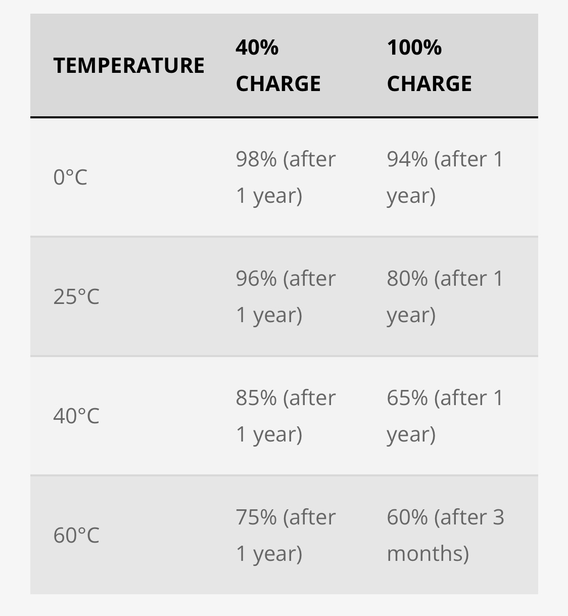 The attached table is from battery university showing how much capacity is lost at different storage temperatures and you can see the benefits of storing at 40% charge and a cool temperature.😊