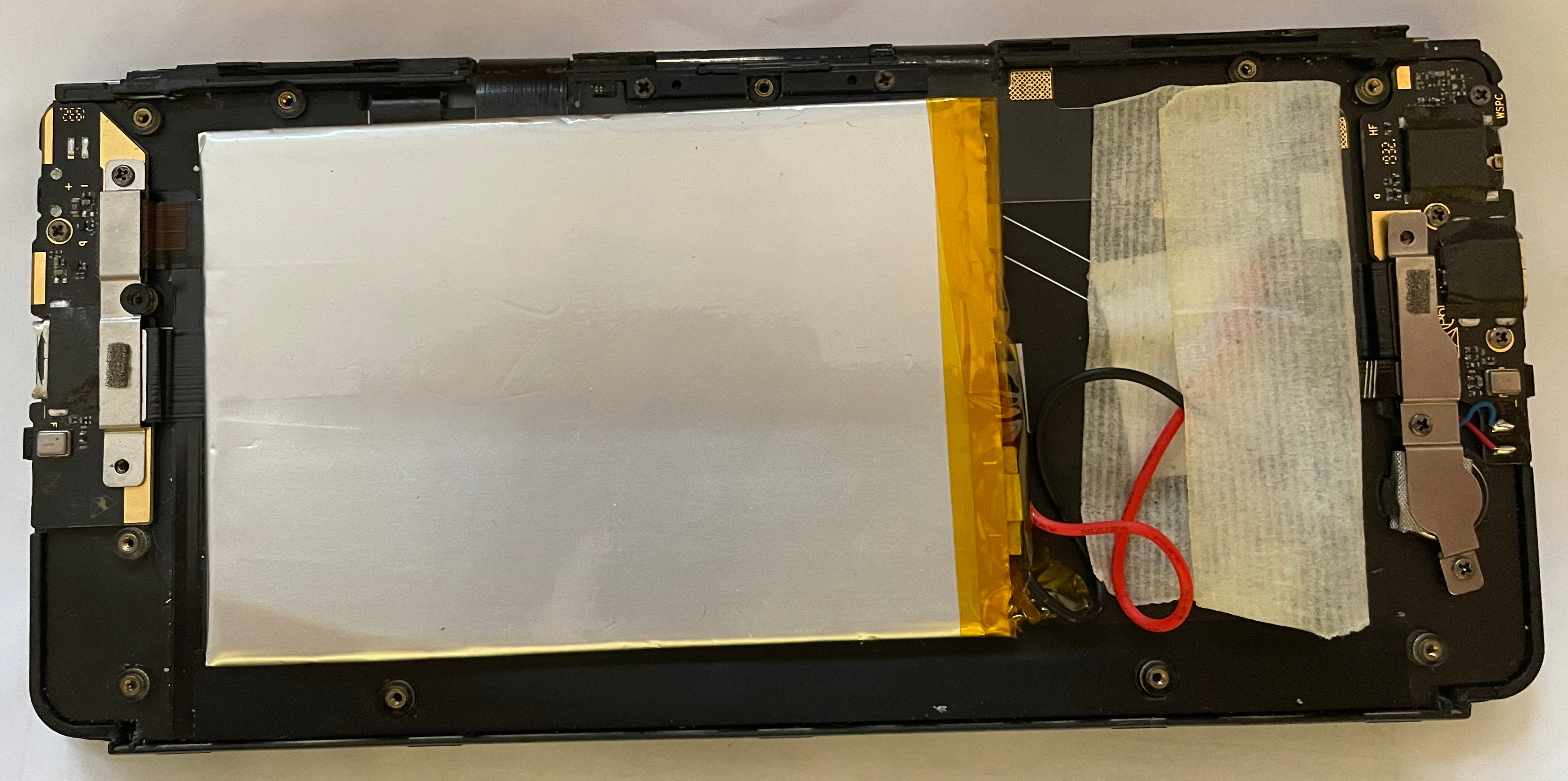 The old cell was connected to its PCB via contact welding the connectors. Luckily, soldering right on the connectors works fine. So I soldered first the black wire of the new battery on the old PCB (mind the polarity, there is also a "B-" on the PCB). Then I hold the red wire on the B+ connector on the old PCB. No smoke ( :-D ), so I soldered the red wire on it as well. Then I disconnected the alu connector of the old cell with a scissor (please do not short anyshing :-) ). Then I isolated everything, taped it with duad side tabe and screw everything together again.